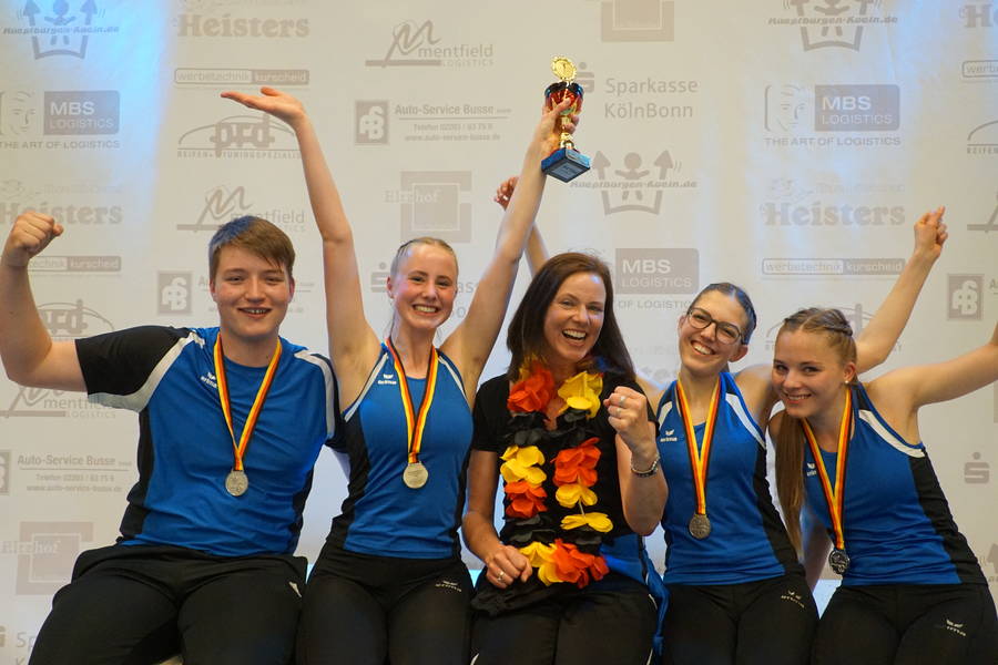 „Jetzt zeigen wir hier allen, was wir drauf haben! Ihr wisst, ihr schafft das.“, motiviert Anja Pöhn ihre Sportler Vanessa Schmidt, Madeleine Engel, Jula Pöhn und Axel Poek und schickt sie auf die Wettkampffläche. Die Sportler verneigen sich vor Kampfgericht und Publikum und beginnen ihre Kür in der Kategorie 4er Kunstradsport Junioren U19 (offen). Aufgrund der hohen Nervosität passiert gleich zu Beginn ein Sturz. Alle konzentrieren sich erneut, wie ihre Trainerin ihnen angewiesen hat: „Bei einem Sturz aufstehen, Krone richten und weiterfahren!“. Insgesamt präsentieren sie jedoch einen sehr schönen Reigen und erreichen damit 154,48 von 179,60 Punkten. Die Mannschaft darf sich damit über Deutsches Silber erfreuen. „Das muss uns erst einmal jemand nachmachen“, erklärte eine Sportlerin später.